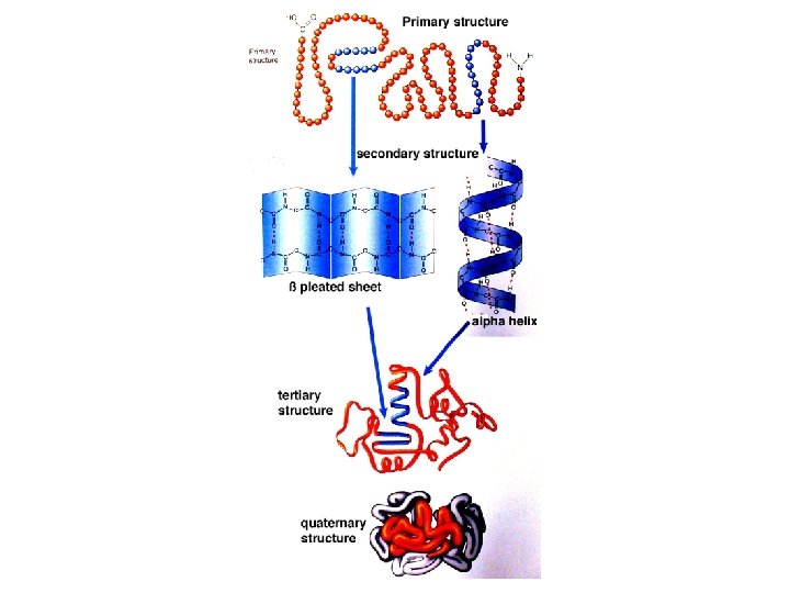 Protein • These long chains are neatly organized inside living things: – Levels of organization: • Primary Structure – the chain • Secondary Structure – the chain curls into an alpha helix or folds into a beta sheet • Tertiary Structure – alpha helices and beta sheets fold on each other • Quarternary Structure – large sections of tertiary structures fold over each other • Let’s see what these looks like: