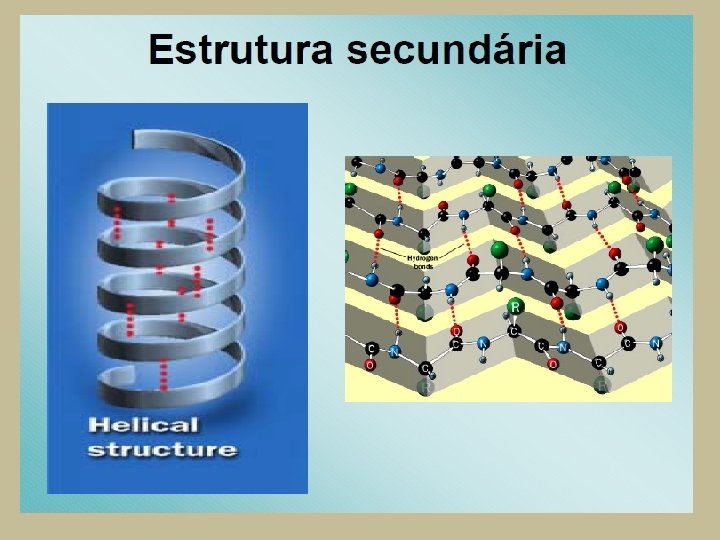 PROTEÍNAS Organização Estrutural • Estrutura Secundária – Mantida pelas ligações de H. Ocorre graças à possibilidade de rotação das ligações entre os C dos aa e seus grupamentos amina e carboxila. Existe uma série de critérios que garantem a estrutura proteica, mas apenas algumas satisfazem os requerimentos necessários para que a estrutura seja estável: estrutura helicoidal ( hélice), originada pelas ligações de H intramolecular, e a estrutura foliar (conformação ) mantida por ligações de H intermolecular. O colágeno faz um tipo especial de arranjo, chamado hélice tríplice.
