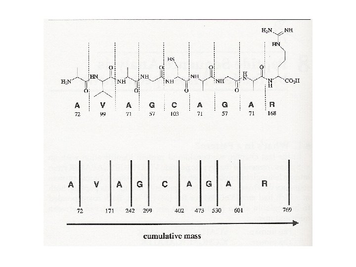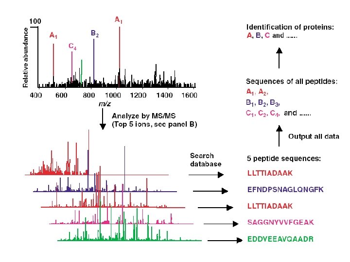 Protein identification by Peptide Mass fingerprint • Use MS to measure the masses of proteolytic peptide fragments. • Identification is done by matching the measured peptide masses to corresponding peptide masses from protein or nucleotide sequence databases.