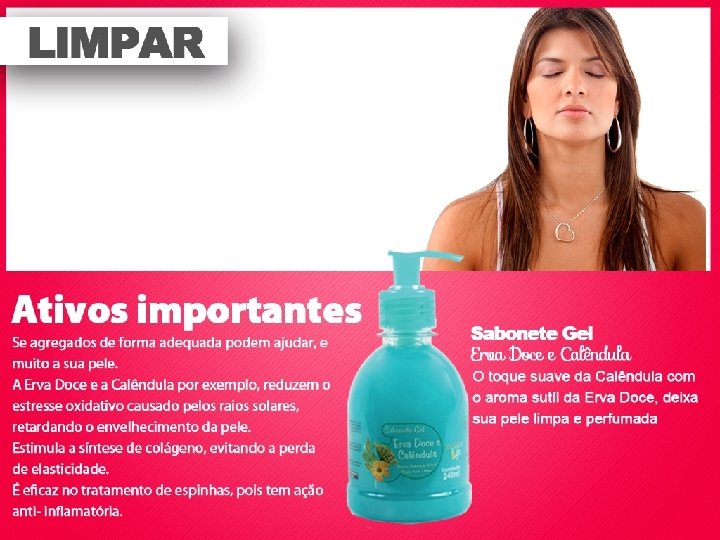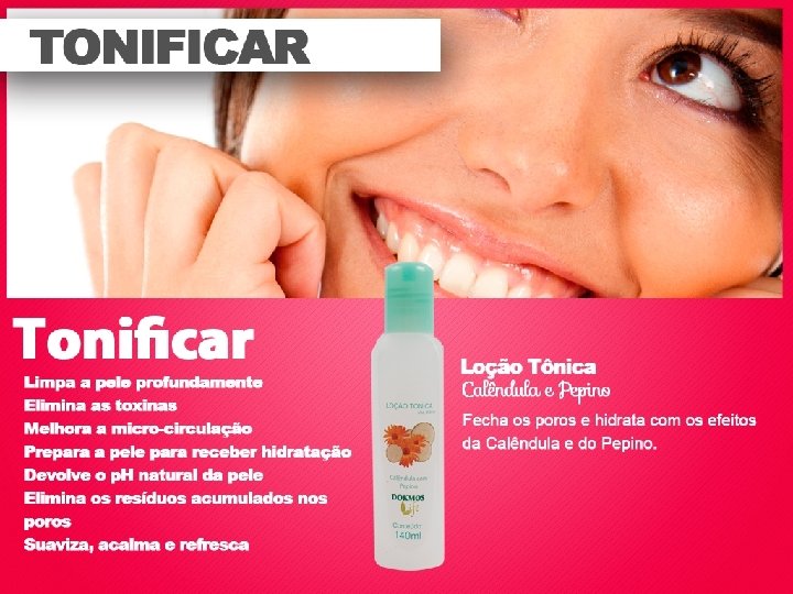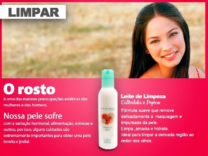 FUNÇÃO DE CADA PRODUTO v Sabonete Líquido – Cód 439 - HIGIENIZAÇÃO v Creme Esfoliante facial – Cód 440 - REMOVER AS CÉLULAS MORTAS E AFINAR A PELE v Máscara Facial de Argila – Cód 368 - REMOVER OS CRAVOS E PROMOVER O PEELING v Loção Tônica Calêndula e Pepino – Cód 367 - FECHAR OS POROS E TONIFICAR A PELE v Protetor Solar – Cód 389 - PROTEGER CONTRA OS RAIOS UVA E UVB