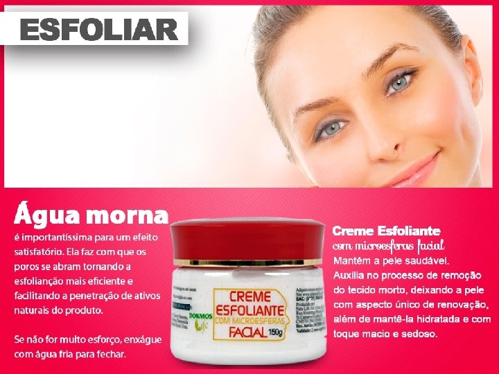 PASSOS 1º Passo: Limpeza - Aplicar SABONETE LÍQUIDO (cód ) sob a pele executando movimentos circulares, retire posteriormente com algodão em disco. 2º Passo: Esfoliação - Aplicar CREME ESFOLIANTE FACIAL (cód ) sob a pele executando movimentos circulares, retire posteriormente com algodão em disco.
