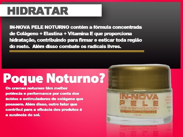 PROTETOR SOLAR dia in. -nova pele - noturno Silicone Aumenta a resistência á água, dando mais sustentabilidade ao fator de proteção Vitamina E Ação antioxidante, rejuvenesce e protege a pele das agressões ambientais Hidrata e amacia.