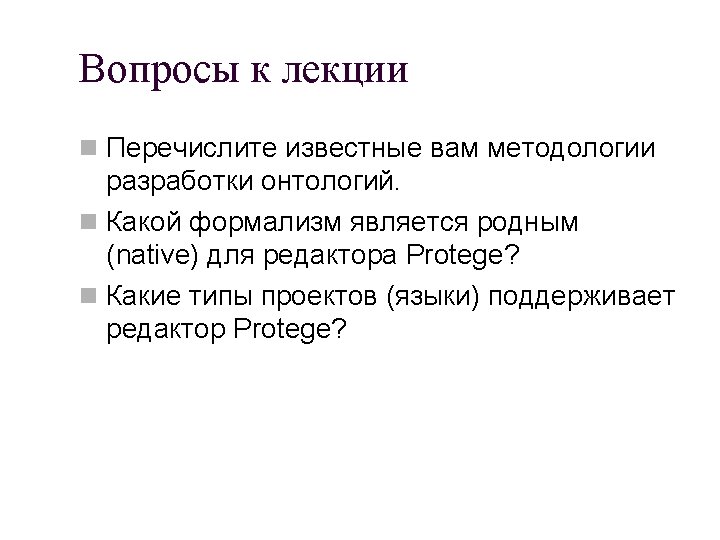 Список других редакторов (для самостоятельного изучения) n Web. ODE (http: //webode. dia. fi. upm. es/web. ODE/) n Onto. Saurus (http: //www. isi. edu/isd/ontosaurus. html) n Web. Onto (http: //kmi. open. ac. uk/projects/webonto/) n Oil. Ed (http: //oiled. man. ac. uk/) n Onto. Edit (http: //ontoserver. aifb. unikarlsruhe. de/ontoedit/) n Oil. Ed (http: //oiled. man. ac. uk/) n Ontolingua (http: //www-ksl. stanford. edu)