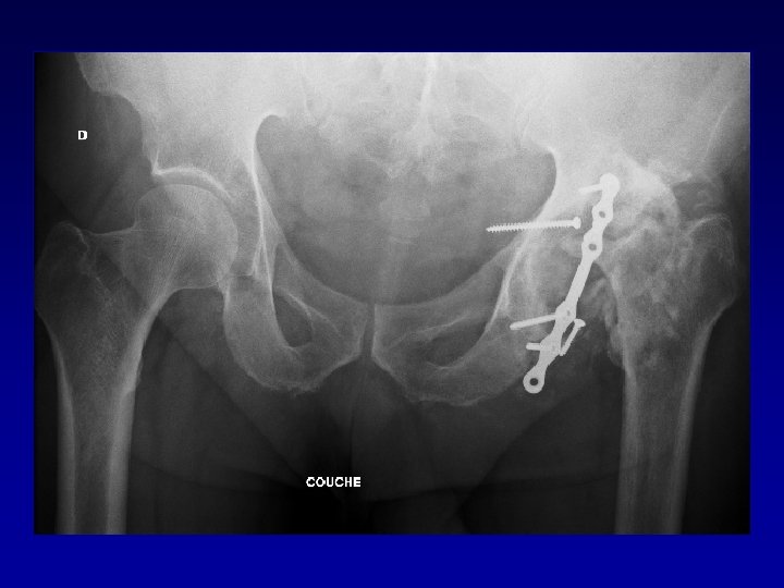 Arthroplastie totale de hanche sur fracture du cotyle complexe Recentrage, reconstruction, orientation du cotyle • • Greffe Ostéosynthèse par plaque MK Surtout si pseudarthrose Réduction de la luxation