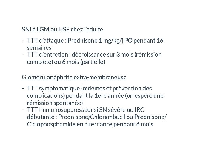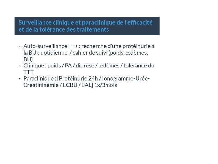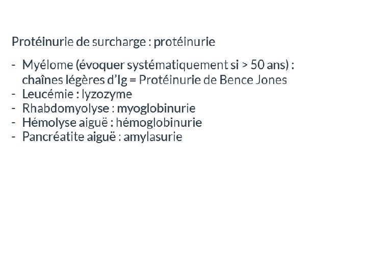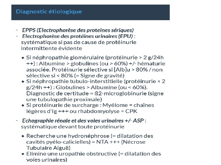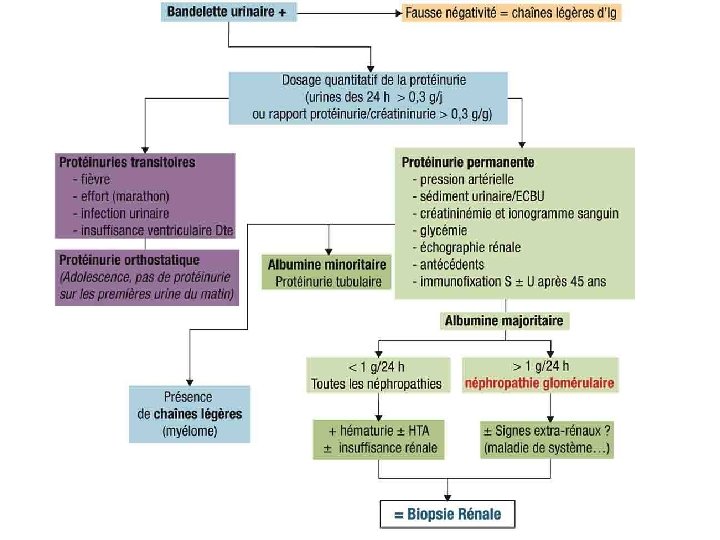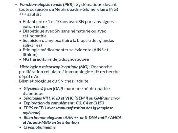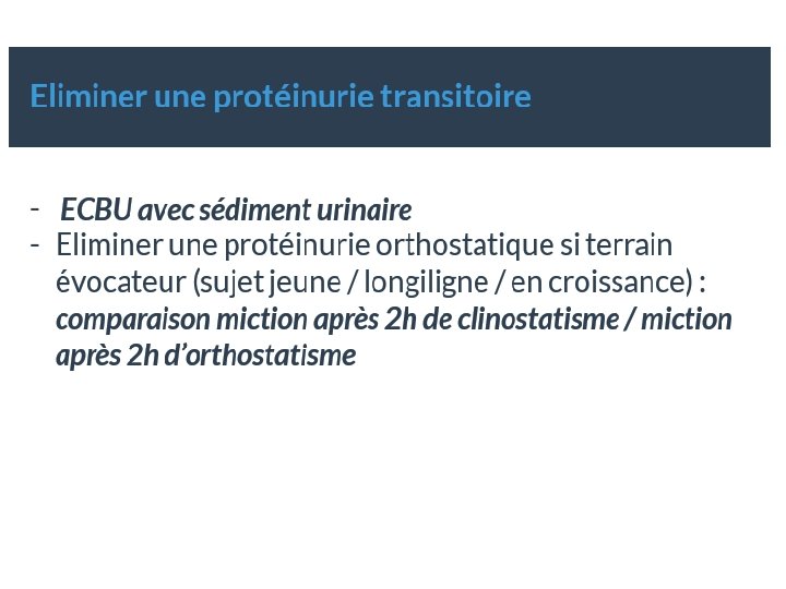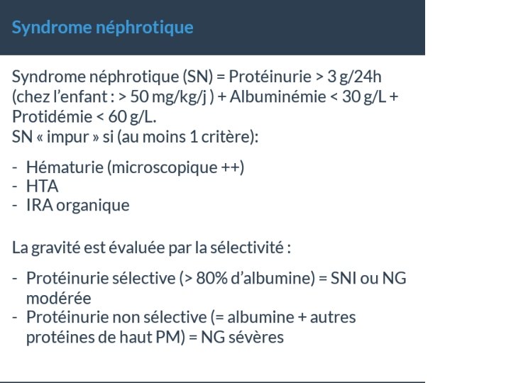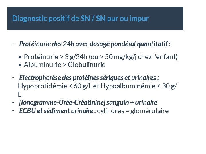 Physiophathologie: �Les glomérules sont imperméables aux protéines de PM > 60 k. Da (dont l’albumine). �Si protéinurie avec albuminurie=anomalie du glomérule: -Fonctionnelle: SNI +++ -Organique: toutes les néphropathies glomérulaires