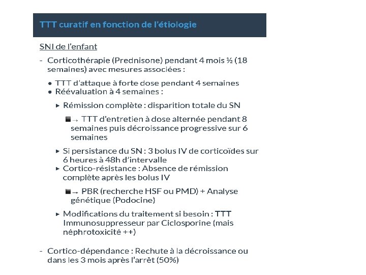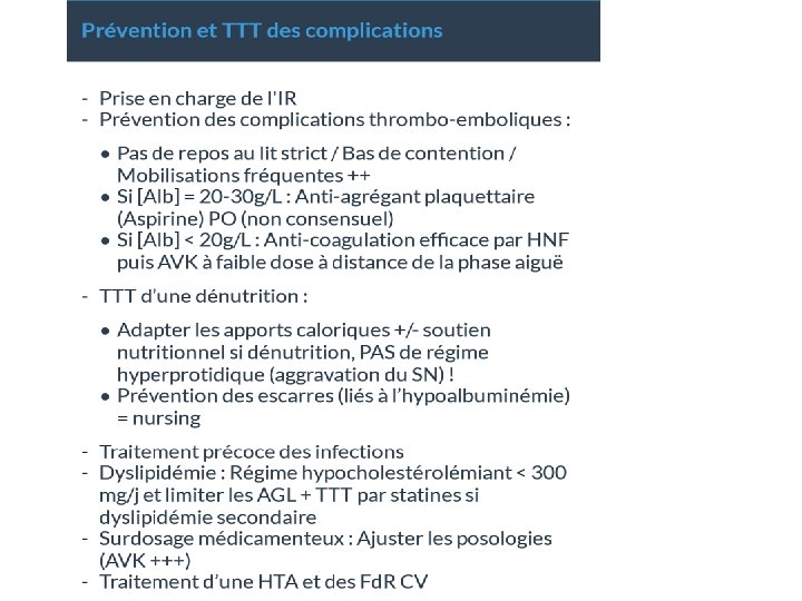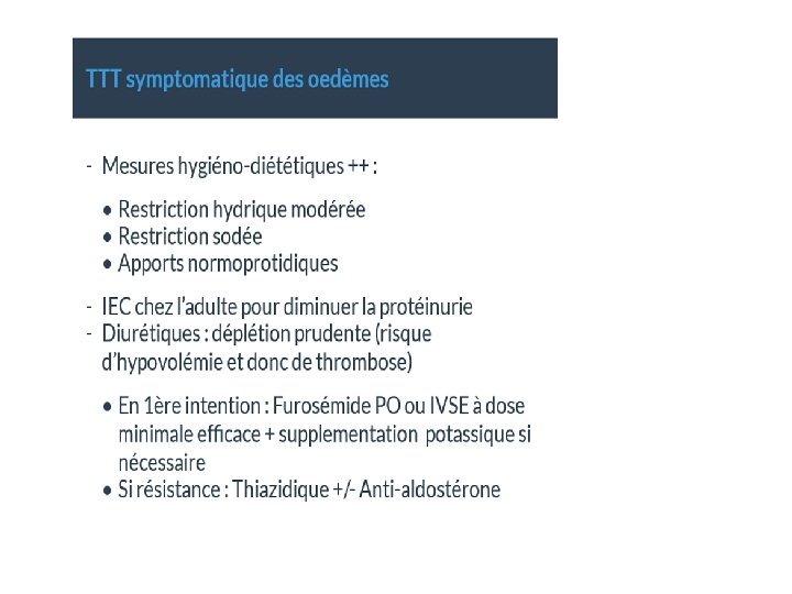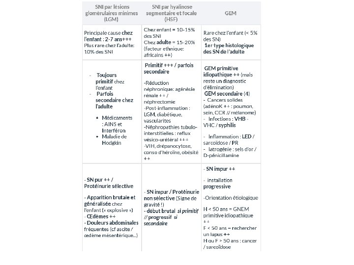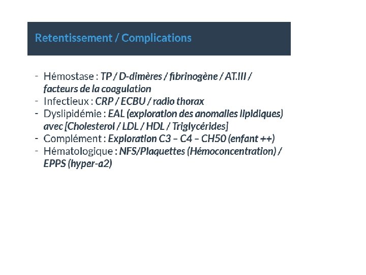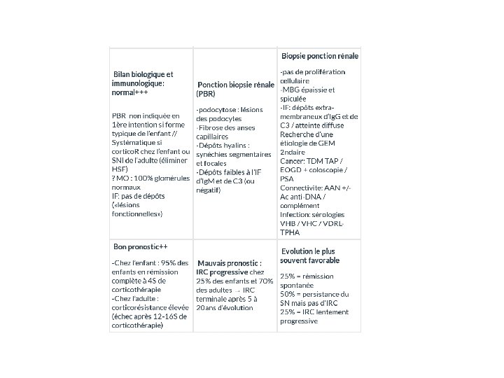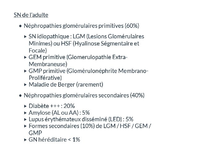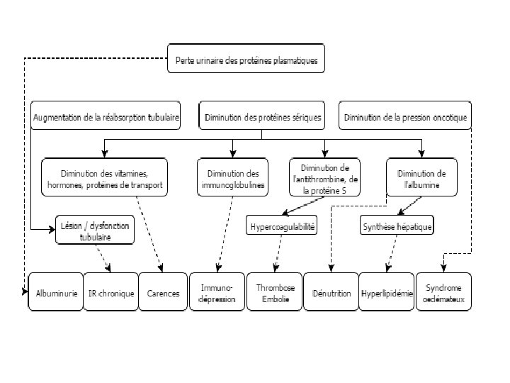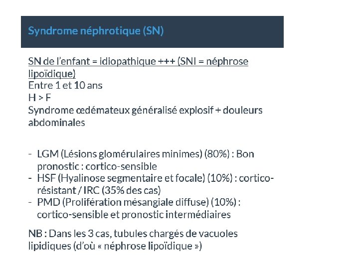 � Augmentation de la perméabilité de la mb basale glomérulaire (MBG) aux protéines plasmatiques : * Glomérules normaux en MO (GON) : Par perte de charges négatives de la MBG (néphrose lipoïdique = SNPP) => diminue la répulsion des protéines * Lésions glomérulaires visibles à la PBR : dépôts et prolifération � Fuite protéique : Albumine, Transferrine, Ig G et A, Transcortine, T 4 Binding Globuline, AT IIIQ et facteur IX, XII, lipoprotéine lipase, 25 OH vitamine D 3 � Conséquences -Albuminurie mal compensée par la synthèse hépatique donc hypoalbuminémie -Œdèmes par baisse de la pression oncotique avec hyperaldostéronisme secondaire à l’hypovolémie. -Augmentation de synthèse hépatique réactionnelle à l'hypoprotidémie : hyperlipidémie de type IIa/b (LDL, VLDL élevés), hypercholestérolémie, hypercoagulabilité (avec anomalie sur les 3 stades de l’hémostase => thrombose veineuse) -Baisse d’Ig, déficit en facteur B du complément (fuite urinaire) : infection � Intérêt de mettre en évidence un SN = sa présence affirme le caractère glomérulaire d’une néphropathie.