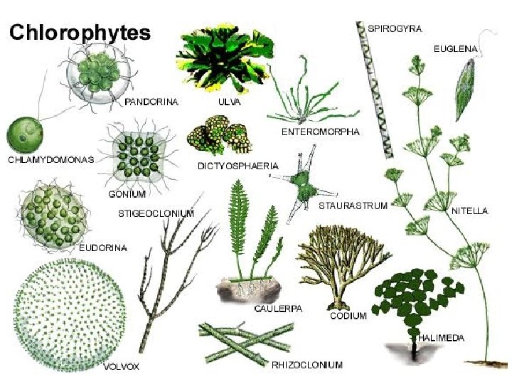 • Filum Chlorophyta dengan warna hijau karena didominasi oleh pigmen berupa klorofil a dan klorofil b, serta karoten dan xantofil. Contoh: Chlamydomonas dan Oedogonium