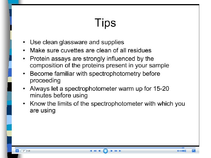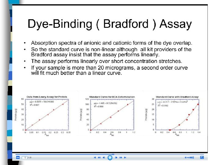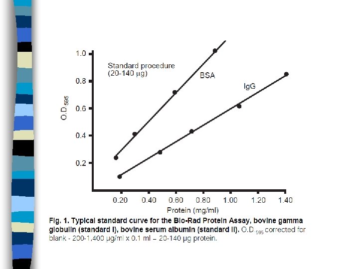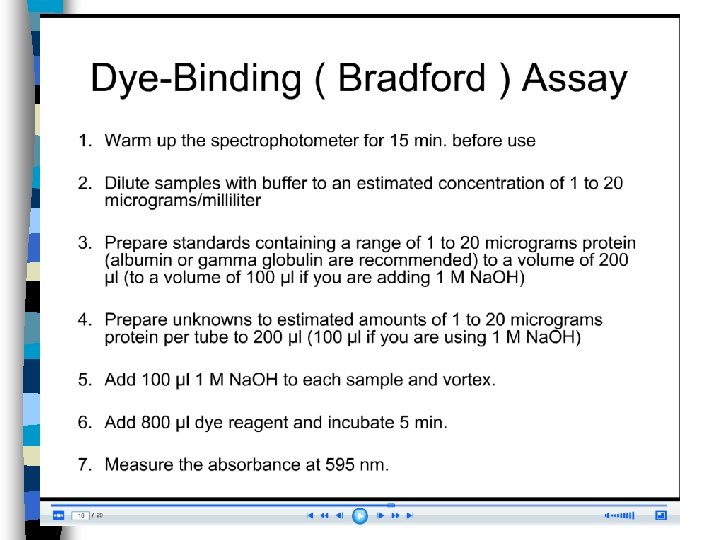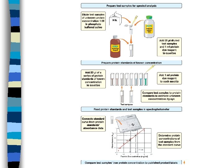 Determination of protein concentration: § several methods are routinely used • the Bradford assay (we use in our experiment) • Lowry assay • BCA assay (Bicinchoninic assay) • ultraviolet absorbance assay, etc. § all of the listed methods rely on the use of a spectrophotometer (measurement of absorbance)