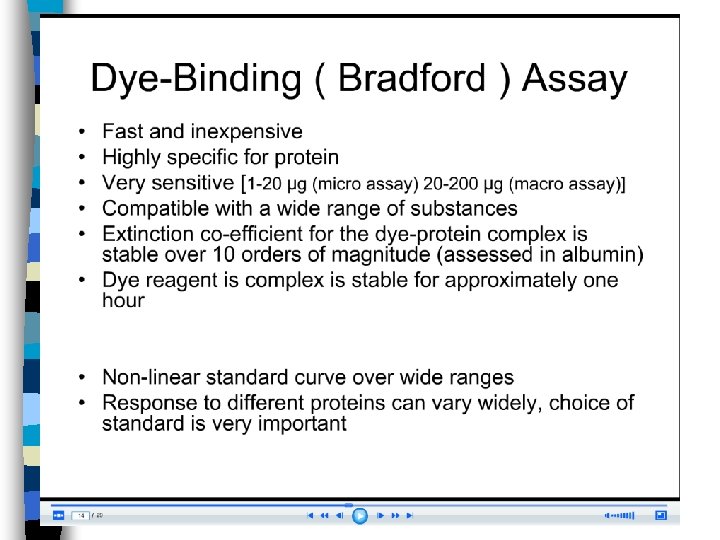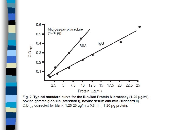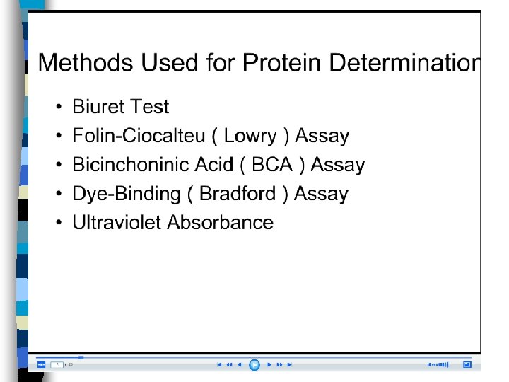 Another methods for protein determination: The Lowry assay § based on detection of tyrosine and tryptophan residues § blue color is developed and detectable with a spectrophotometer in the range of 500 -750 nm