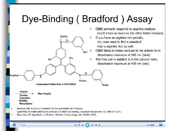 Principle of the Bradford method § colorimetric assay based on absorbance shift of Bradford reagent that occurs after its binding to proteins § Bradford reagent contains Coomassie Brilliant Blue G-250 dye that binds to basic and aromatic amino acid residues (arginine (ARG), fenylalanin (PHE), tryptophan (TRY) a prolin (PRO)