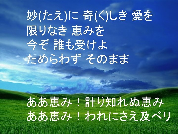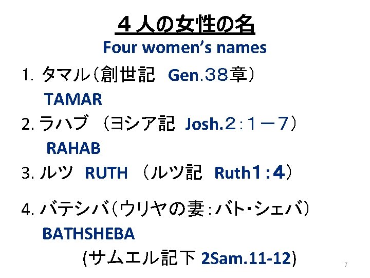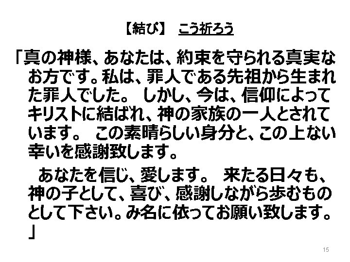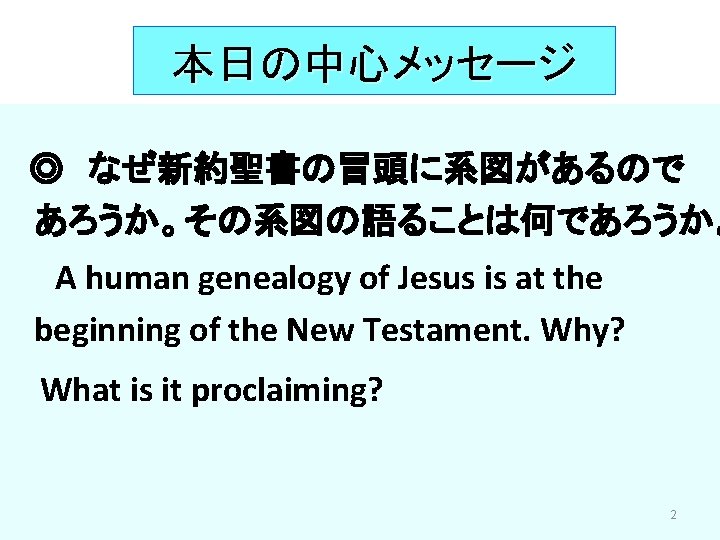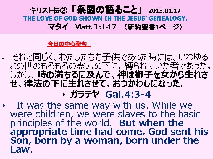 実現 • 時の満ちるに及んで、神は御子を女から生 れさせ、律法の下に生れさせて、おつかわし になった。 • ガラテヤ Gal. 4: 3 -4 • It was the same way with us. While we were children, we were slaves to the basic principles of the world. But when the appropriate time had come, God sent his Son, born by a woman, born under the Law.