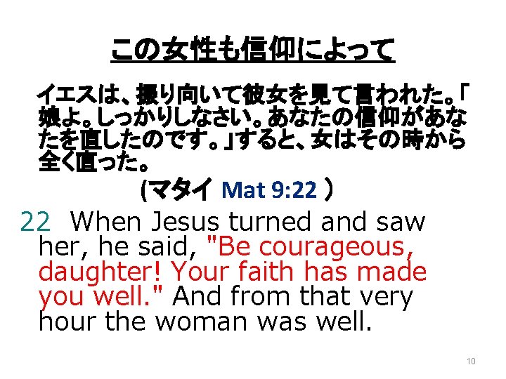 「信仰によって、遊女ラハブは、偵察 に来た人たちを穏やかに受け入れ たので、不従順な人たちといっしょに 滅びることを免れました。」 (ヘブライ Heb 11: 31) • 31 By faith Rahab the prostitute did not die with those who were disobedient, because she had welcomed the spies with a greeting of peace. 9