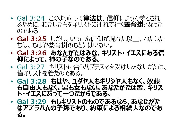 • Gal 3: 24 And so the Law was our guardian until the Messiah came, so that we might be justified by faith. • Gal 3: 25 But now that faith has come about, we are no longer under a guardian. • Gal 3: 26 For all of you are God's children through faith in the Messiah Jesus. • Gal 3: 27 Indeed, all of you who were baptized into the Messiah have clothed yourselves with the Messiah. • Gal 3: 28 Because all of you are one in the Messiah Jesus, a person is no longer a Jew or a Greek, a slave or a free person, a male or a female. • Gal 3: 29 And if you belong to the Messiah, then you are Abraham's descendants indeed, and heirs according to the promise.