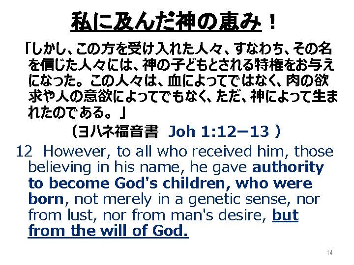 「私は福音を恥とは思いません。福音 は、ユダヤ人をはじめギリシヤ人にも、 信じるすべての人にとって、救いを得 させる神の力です。」 (ローマ Rom 1: 16) 16 For I am not ashamed of the gospel, because it is God's power for the salvation of everyone who believes, of the Jew first and of the Greek as well. 11