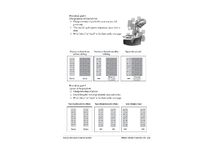 Charged Plastic and Hand • When the plastic strip is rubbed on the skin, electrons from the skin are transferred to the plastic giving the plastic a negative charge. • When the plastic is moved near the desk, electrons in the desk are repelled by the negatively charged plastic. • This leaves an area of positive charge in the desk near the plastic. • The negative plastic and the positive area of the desk attract.