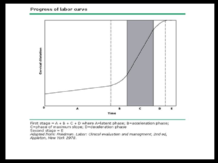 Friedman's data • 500 primigravidas • The first stage of labor was further divided into the latent phase, acceleration phase, phase of maximum slope, and a deceleration phase • Transition from the latent phase to the acceleration phase appeared to occur at 3 to 4 cm • Minimum rate of acceptable cervical dilation during the active phase of labor was 1. 2 cm/hour for nulliparous patients and 1. 5 cm/hour for multiparous patients