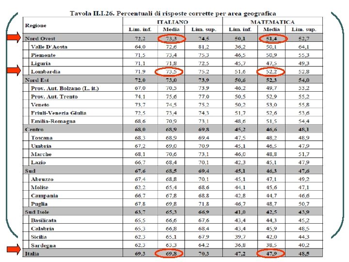 LA RESTITUZIONE DEI DATI § Pubblicazione di una Sintesi dei primi risultati e di un Rapporto nazionale basato sui dati delle classi campione (somministrazione delle prove e imputazione delle risposte a cura di un osservatore esterno) § Analisi effettuate solo su dati aggregati in modo da garantire pienamente l’anonimato dei singoli allievi e delle singole scuole. • Analisi che forniscono un quadro generale dei livelli di apprendimento degli studenti italiani § Restituzione in via esclusiva e riservata dei dati a ciascuna scuola • Dati aggregati per istituto o suddivisi per classe; non sono disponibili dati disaggregati per alunno • Dati disaggregati item per item • Dati sui quali avviare riflessioni e approfondimenti in merito alle scelte nell’organizzazione della didattica, anche in un’ottica di confronto con le altre scuole