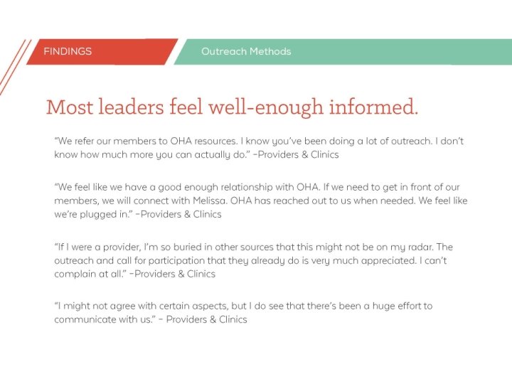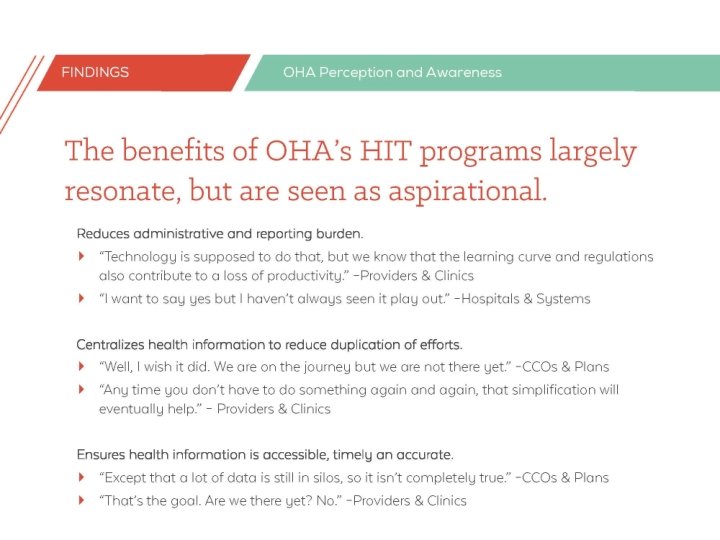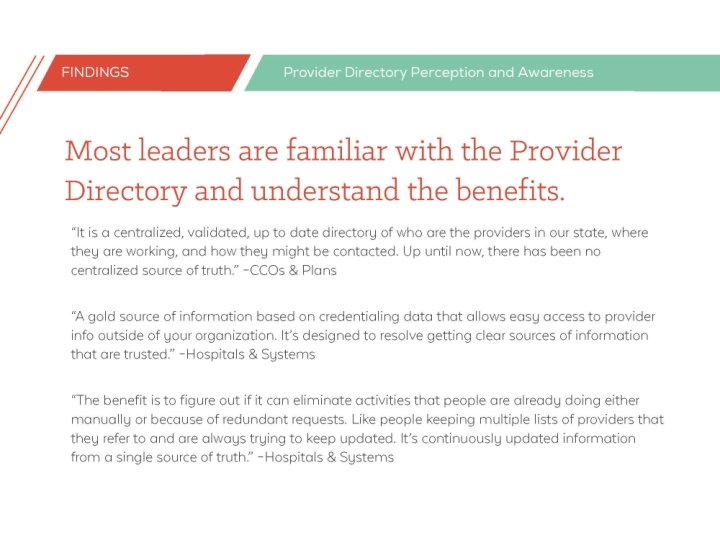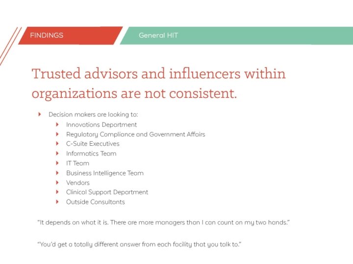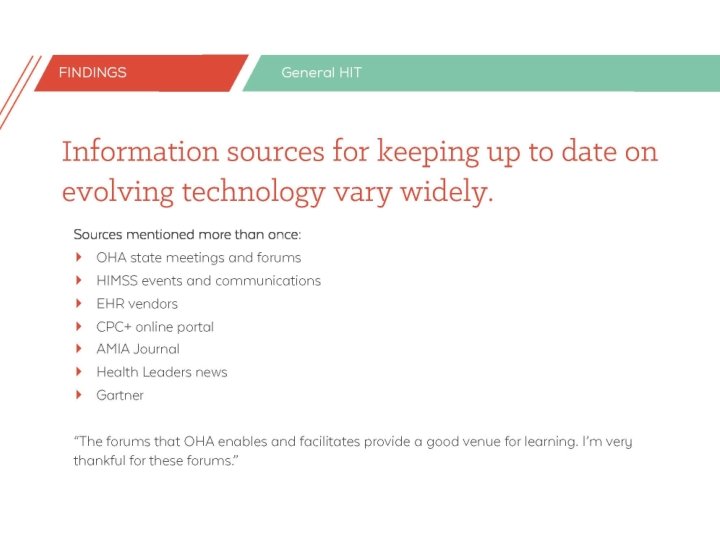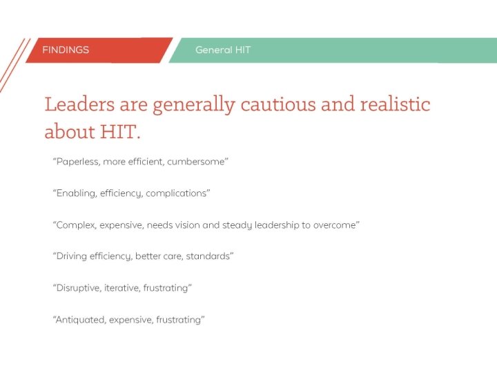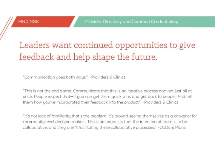 13 individuals across settings • Executive level • Decision makers or influencers • Rural representation • • Coordinated care organizations Health plans Providers and clinics Hospitals and health systems