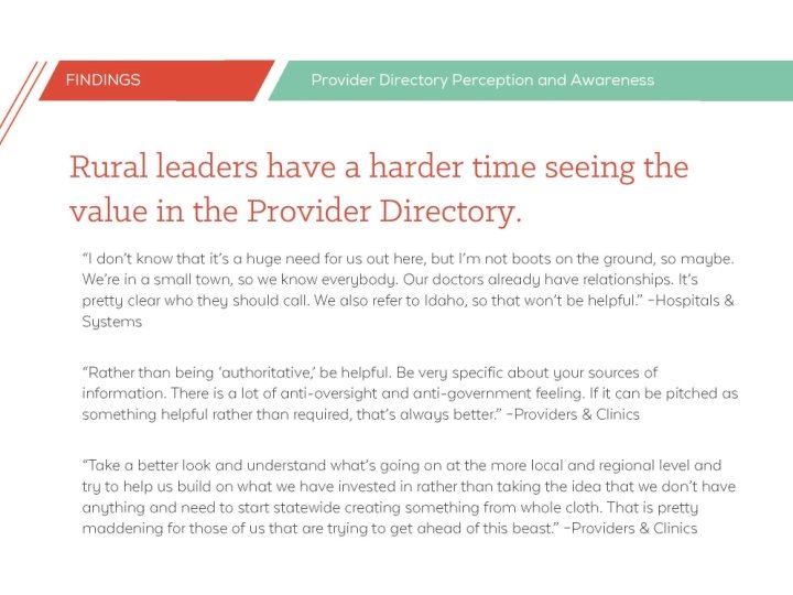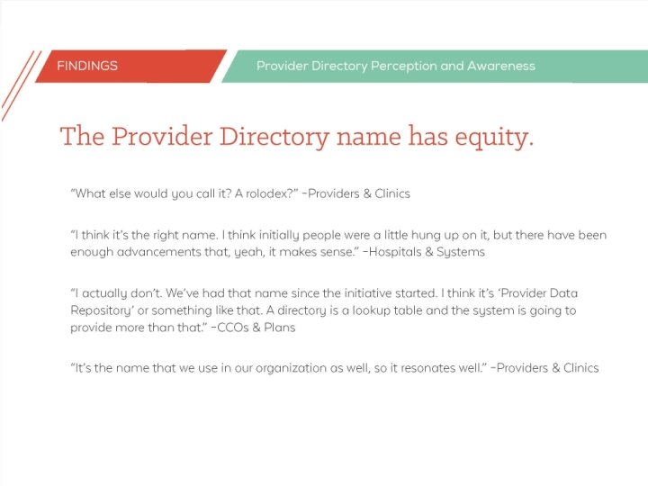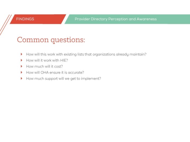 Input on future phases • Review “Phase 2” • How would you describe the status of the provider directory? • What kinks may be worked out in phase one? • What gaps might still exist? • Thinking about the status of the directory after soft launch, who should be targeted to adopt after the initial go-live? • How many organizations/users should be targeted in the next phase? • Should we focus on a specific type of organization (e. g. , CCOs or hospitals)? Should we diversify? • How much time should we allow between phases and give enough time for adoption and use? • What is the best way to plan for phases while remaining nimble and responsive?