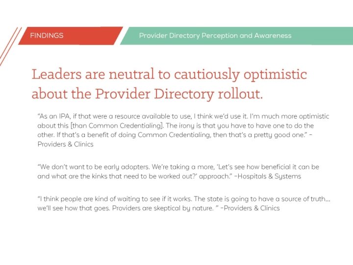 Provider Directory Implementation Update Project Timeline Dec 2017 – Aug 2018 - Design, Development & Implementation ü Dec 2017: Vendor onboard ü Jul 2018: UAT ü Aug 2018: Initial go-live (focused on Medicaid enterprise) Sep 2018 – Nov 2019 - Data source and user onboarding and support ü Continued onboarding of users and additional data sources Current Project Activities • Finalized project schedule • Refining/clarifying requirements • Analyzing rules/processes including data matching criteria, data source prioritization, and access using One. Health. Port • Working with representatives from tier 1 data sources to gather more detailed information. • Developing legal agreements • Flat File Directory (FFD) transition planning • Communication contractor interviews about HIT initiatives with Provider Directory stakeholder participants