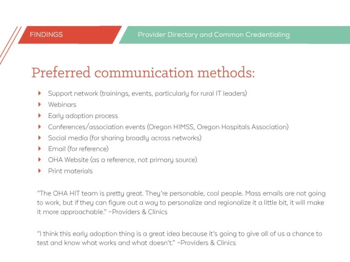 Question for PDAC on alignment • Common Credentialing will be sharing authoritative information with the Provider Directory • Data that are not for provider directory purposes such as peer references, personal information (home address/social security number), liability, and attestation questions will not be shared • The Provider Directory will have additional fields that are not required or not included in the Common Credentialing solution • E. g. , HIE endpoints, languages, accepting new patients • How do we ensure people know about how Common Credentialing and Provider Directory align and where they do not? • Where is there confusion that OHA needs to address?