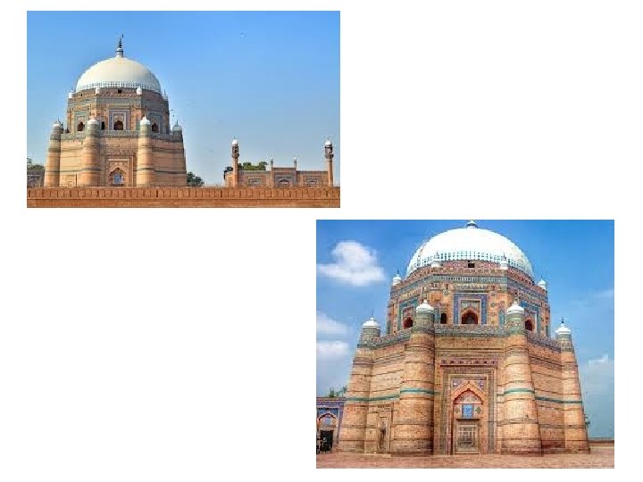 Shah Rukn-i-Alam Location : Multan Fort, Punjab History: The tomb of Shah Rukn-i-Alam was built by the Tughluq ruler of Delhi, Ghiyasud- din, between 1320 and 1324 AD Descriptions 1. The three-tier structure 2. It is octagonal in shape with an interior diameter of 15 metres walls assisted by 8 engaged corner towers or buttresses with a clear slope, support an 8 metre octagon surmounted by a dome with a diameter of 15 metres