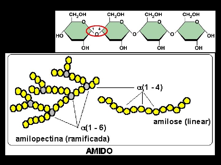 Amido • É o principal carboidrato da dieta; • Carboidrato de armazenamento dos cereais, raízes de vegetais e leguminosas; • Contém somente monômeros de glicose – Amilose (ligações glicosídicas α-1, 4, cadeia linear) – Amilopectina (ligações glicosídicas α-1, 4 e α 1, 6, cadeia ramificada)