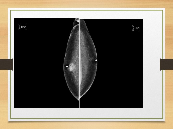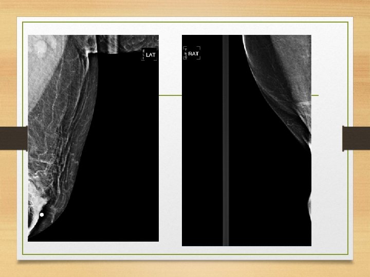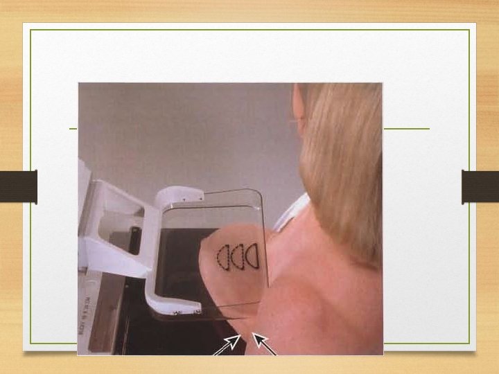 • Una proyección óptima requiere: • A) visualizar las porciones externa e interna de la mama, • B) Visualizar grasa de Chaissagnac • C) Visualizar el pectoral mayor • D) Visualizar el pezón bien alineado.