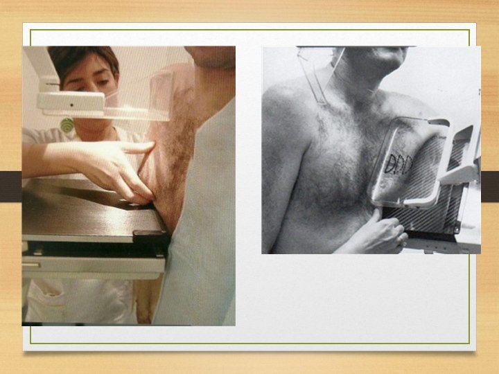 Posición de la mama masculina • Se coloca similar a una mama femenina pequeña. • La OML se usa para obtener imágenes en proyección lateral. • La CC se puede hacer caudocraneal.