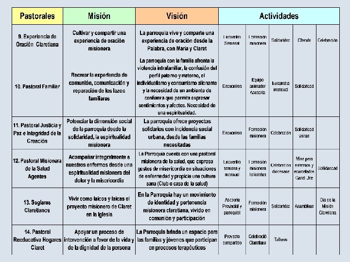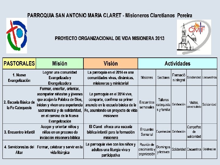 LA PARROQUIA QUE SOÑAMOS 7. Catequética, fortalecedora del proceso de la iniciación y la madurez cristiana, del crecimiento integral de la persona, con especial atención a niños y jóvenes, a las familias y a los líderes evangelizadores. 8. Fortalecida por la vivencia de la espiritualidad claretiana que se manifiesta en la experiencia de servidores y oyentes de la Palabra, eucarísticos e Hijos del Inmaculado Corazón de María en COMUNIDAD MISIONERA.