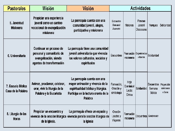 LA PARROQUIA QUE SOÑAMOS 5. Comunitaria, dinámica, creativa y testimoniante, en la misión compartida, conformada por pequeñas comunidades cristianas que unidas entre sí, se integran en una efectiva comunión con la Iglesia local y con otras instituciones. 6. Celebradora de la vida y de la fe, centrada en la vivencia de la Palabra y de los sacramentos; Convirtiendo las celebraciones litúrgicas, especialmente la eucaristía dominical, en motor y centro de la vida de la comunidad parroquial.