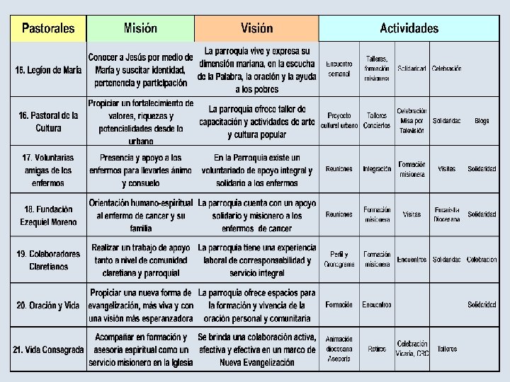 PASTORAL PARROQUIAL Construir una Iglesia de comunión y participación, por medio de un proceso de formación bíblica, teológica, catequética y de análisis de la realidad seria y profunda que posibilite la experiencia cristiana de comunidades de vida. Comunidades que tengan una clara conciencia eclesial y política, construyan proyectos litúrgicos y catequéticos nuevos y alternativos y hagan de la parroquia verdadera comunidad de comunidades, posibilitando así la presencia del Reino de Dios. Plan Provincial de Vida Misionera pág 53