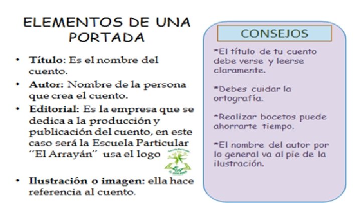 La contraportada ¿Qué es? Es la parte posterior o trasera de un libro. Suele contener información del autor o un resumen del libro. Además de la editorial y una ilustración. 4 CONSEJOS PARA UNA BUENA CONTRAPORTADA 1. Diseño coherente: Éste ha de complementarse con el de la portada, continuando la misma línea y usando elementos similares (colores, tipografía). Un diseño muy eficaz es hacer la contraportada continúe la escena de la portada. 2. Menos es más: Tanto portada como contraportada no se deben sobrecargar, y evitar incluir en cada espacio toda clase de información. Si quieres incluir tu biografía, es mejor limitarse a tu nombre con un par de líneas contenidos relevantes (logros, premios por ejemplo), acompañado de tu fotografía. 4. La sinopsis ha de ser breve: Este resumen no debe ser demasiado largo. 3. Basta con tener el título en la portada: No hace falta que incluyas el título también en la contraportada. El lector potencial estará ojeando varios libros en una librería y no tiene tiempo para detenerse a leer textos muy extensos. Tampoco debe revelar demasiados detalles de la trama, sólo los suficientes para despertar la curiosidad del lector de modo que sienta la necesidad de leer tu cuento.