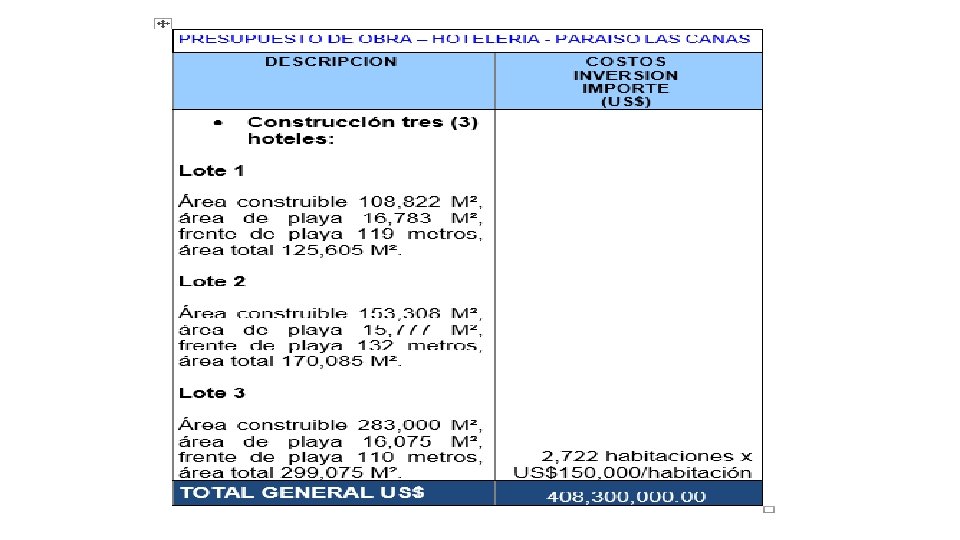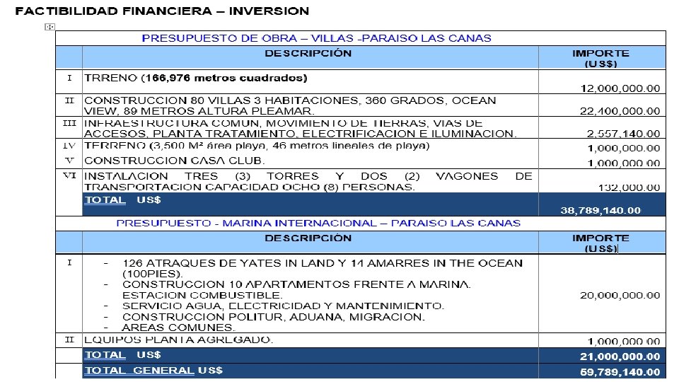 CAPITAL REQUERIDO VILLAS INMOBILIARIAS $ 38, 789, 140 MM BREAKDOWN Terreno en valor nominal por concesión (166, 976 metros cuadrados). AMOUNT $12, 000 M Construcción 80 villas, 360 grados, ocean view 89 metros altura pleamar. $22, 400, 000 M Movimiento de tierras. Vias acceso. CAPITAL REQUERIDO Accesos internos. $2, 557, 140 M Planta tratamiento, Electricidad e iluminación. Terreno 3, 500 M² area playa, 46 metros lineales de playa. $1, 000 M Construcción Casa Club. $1, 000 M Instalación dos(2) torres y vagones transportación capacidad ocho(8) personas. $132, 000