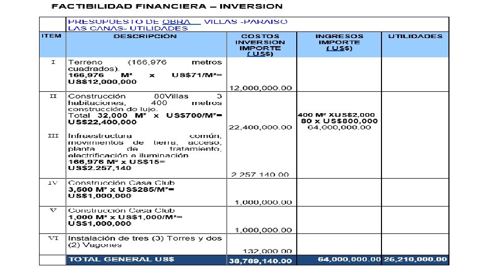 VILLAS INMOBILIARIAS Proyección Financiera a 5 años $38. 8 Million Investment INGRESOS PREVENTA VILLAS Year one PARAISO LAS CANAS Proyección financiera a 5 años Paraiso Las Canas By Miguel Martinez Year Three Year Four Year Five $19, 200, 000 INGRESOS VENTA VILLAS INGRESOS MANTENIMIENTO VILLAS INGRESOS TOTALES Year Two $19, 200, 000 Accumulated $19, 200, 000 $21, 280, 000 $42, 560, 000 $1, 248, 000 $4, 992, 000 $22, 528, 000 $1, 248, 000 $66, 752, 000 GASTOS TOTALES $ 19, 589, 140. 00 INGRESOS NETOS ($389, 140) $22, 528, 000 $1, 248, 000 $47, 162, 860 0% 0% -5034% INVERSION -5034% $ 38, 789, 140. 00 ROI -1% 58% 3% 3% 122% ($8, 367) $484, 352 $26, 832 $1, 014, 001 NOI COSTOS FINANCIEROS INGRESOS NETOS DESPUES DE COSTOS FINANCIEROS DESPUES DE PAGOS COSTOS FINANCIEROS $19, 589, 140 $46, 148, 859 119%