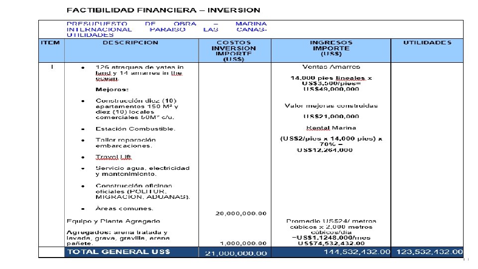 CAPITAL REQUERIDO MARINA INTERNACIONAL – PLANTA AGREGADOS US$21 MM BREAKDOWN 126 Atraques de Yates in land de 100 pies y 14 amarres in the ocean. AMOUNT $20, 000 Construcción 10 apartamentos frente a la Marina. Estación combustible. CAPITAL REQUERIDO Servicio agua, electricidad y mantenimiento. Constucción Politur , Aduana , Migración. Areas comunes. Equipos y planta de agregado. $1, 000