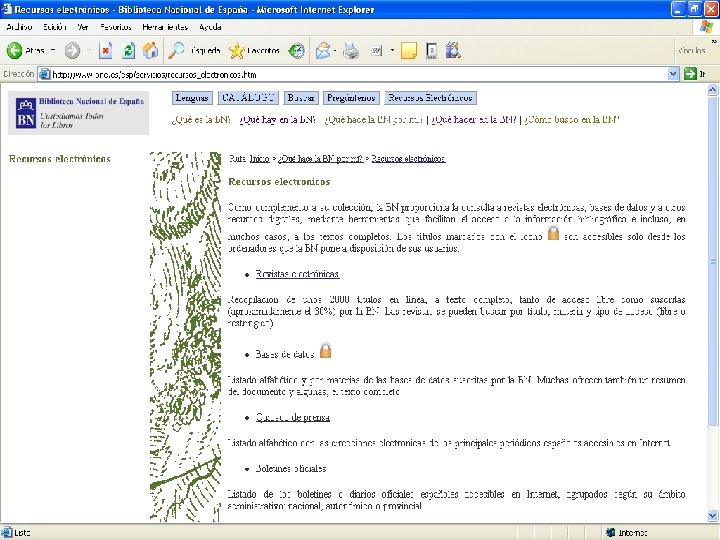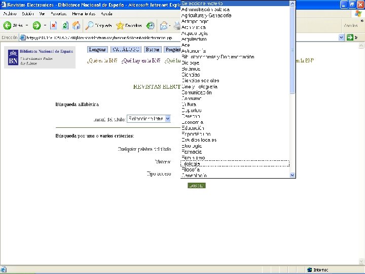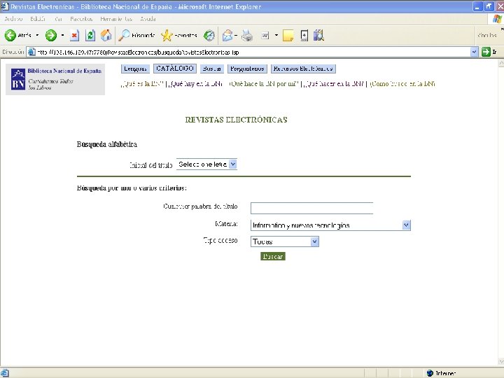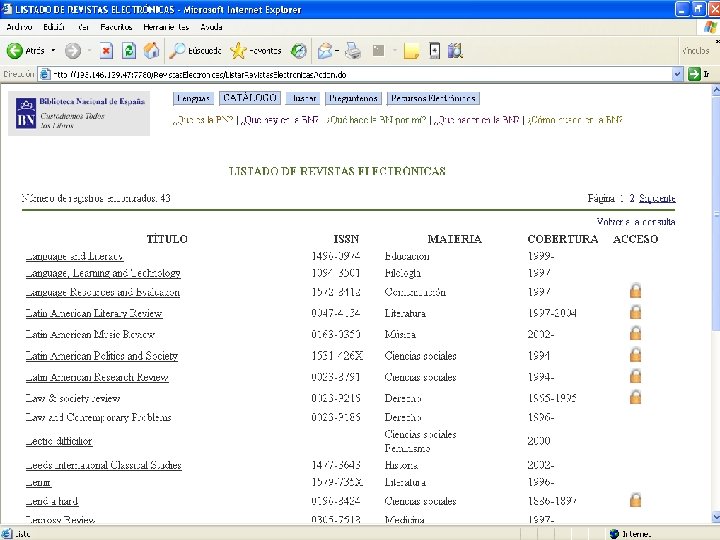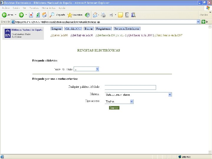 Acceso a las revistas electrónicas Ø Acceso a 2. 731 títulos de revistas electrónicas: Libres Ø Suscritas Ø Ø La revistas se pueden buscar por: Título Ø Materia Ø Tipo de acceso Ø Ø El 46 % de los títulos son suscripciones y, por lo tanto, son únicamente accesibles desde cualquier ordenador de la BNE (reconocimiento de IP)