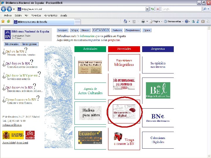 ¿Cómo? Ø Ø Promoviendo una nueva Ley del Depósito Legal que amplíe el objetivo de preservación, incluyendo los contenidos digitales Iniciando el archivo de la Web (como ya han hecho los catalanes, proyecto Padicat) Instaurando el archivo voluntario para los editores y autores de contenidos digitales Reuniendo los contenidos digitalizados en bibliotecas y otras instituciones culturales: desarrollando la Biblioteca Digital Hispánica, como aportación española al proyecto de Biblioteca Digital Europea
