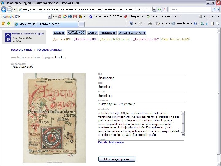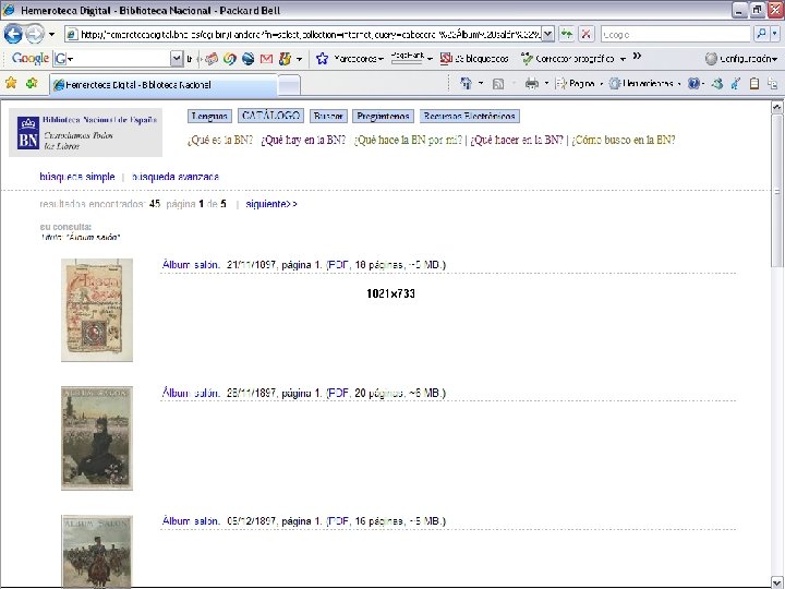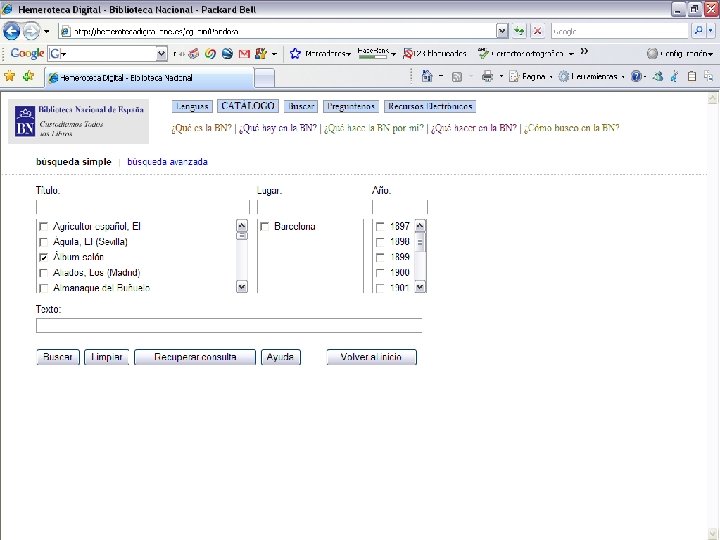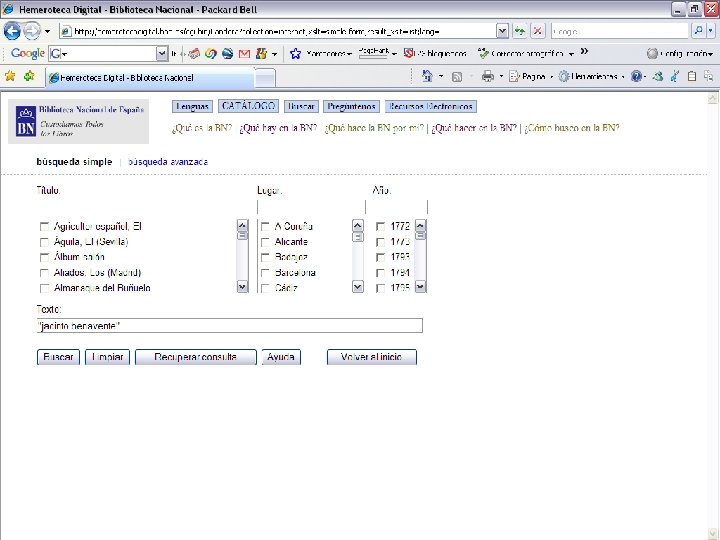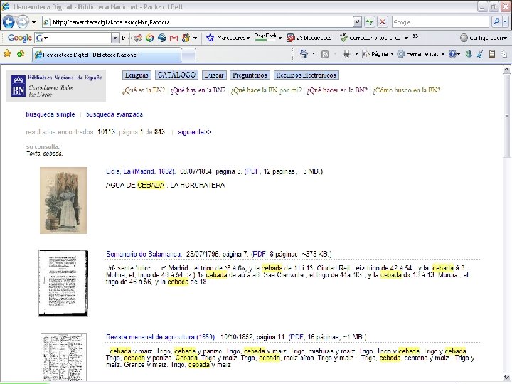 Digitalización de la prensa histórica Ø Ø Complementaria a la digitalización sistemática de prensa contemporánea (más de 50 millones de páginas actualmente disponibles) Con tratamiento de OCR que permite la búsqueda y recuperación a texto completo Con una aplicación específica de búsqueda y consulta en plataforma web Con una primera selección de 500. 000 páginas de más de 100 títulos de prensa española de los siglos XVIII y XIX