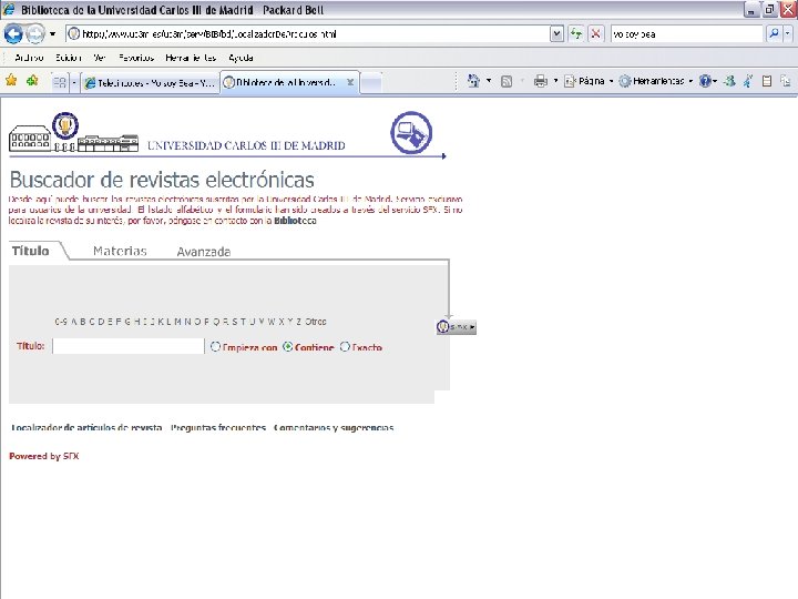 Beneficios de SFX n n n El vínculo consistente a través de los recursos de información facilita al usuario la navegación entre recursos muy variados Proporciona datos de uso independientes del proveedor Una vez configurado, el servidor de SFX es un repositorio de revistas electrónicas muy útil para la biblioteca, ya que puede generar un listado alfabético y proporcionar opcionalmente los registros Marc para cargarlos en el catálogo