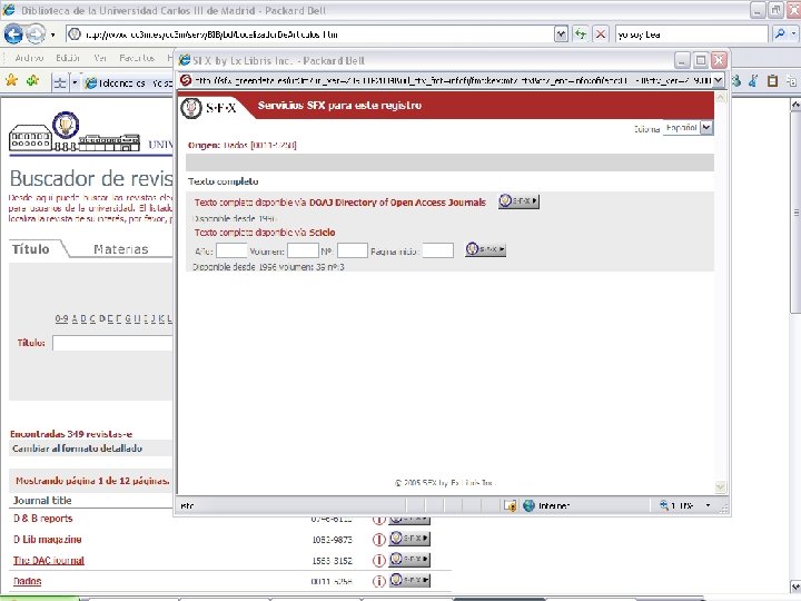 SFX y los bibliotecarios n n Dentro de SFX se mantiene una base de datos que describe la colección de la biblioteca El bibliotecario define las fuentes (sources), los servicios y los destinos (targets) Los “límites” definen entonces qué información se requiere para cada enlace El enlace de la fuente va al sistema para ver qué opciones hay disponibles, chequea los límites y determina qué servicios se pueden ofrecer a un usuario concreto