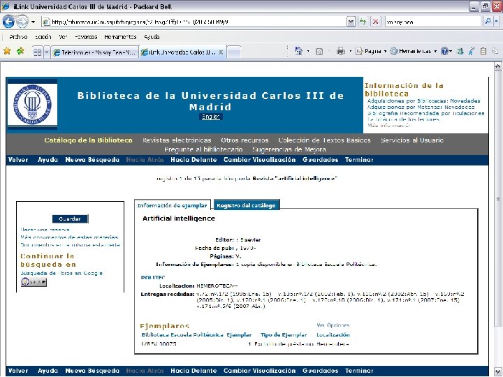 ¿Cómo funciona Metalib? Ø Ø Ø El sistema permite la búsqueda simultánea y transversal en diversos recursos electrónicos El usuario puede seleccionar los recursos sobre los que quiere realizar la consulta El sistema, mediante diversos protocolos de comunicación (Z 39. 50, Entrez, HTTP, OAI-PMH, la unifica El sistema desduplica los resultados Unifica listados (modificación de campos) Convierte los registros a Marc 21