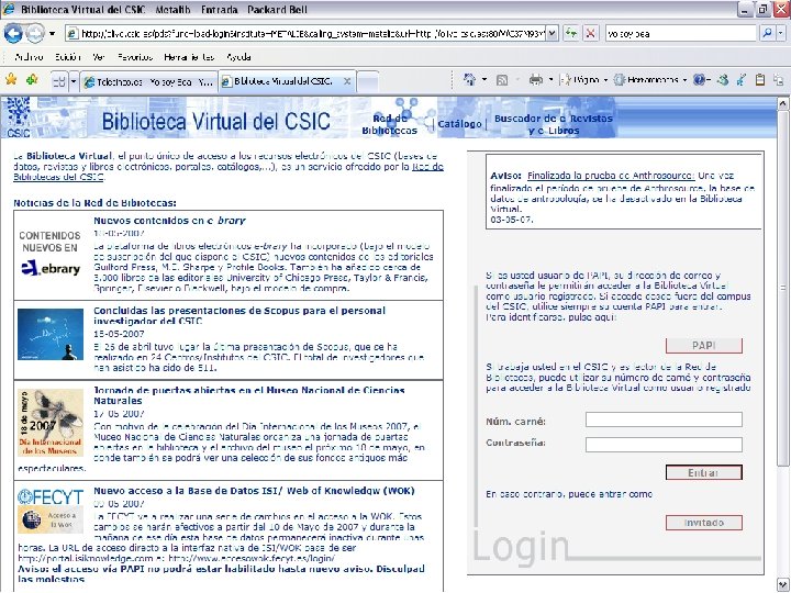 Metalib y los usuarios Ø Metalib ofrece al usuario: Un metabuscador que le permite realizar búsquedas simultáneas sobre los recursos que haya seleccionado previamente Ø Un buscador de recursos para conocer los recursos que la biblioteca ofrece Ø Un buscador de revistas electrónicas Ø Portal personal donde encuentra los recursos y revistas que ha seleccionado en sesiones anteriores, además de otros servicios: Ø Ø Archivo de artículos de interés Servicio de Difusión Selectiva de Información Historial de búsquedas