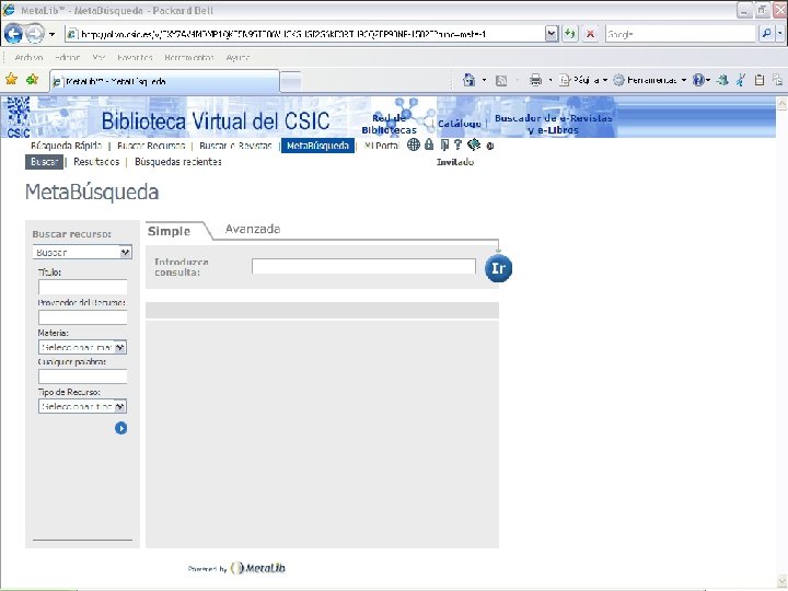 El metabuscador Ø Ø Ø Un metabuscador es una herramienta que permite ofrecer un portal único de acceso a todos los recursos de información y, lo que es más importante, permite realizar búsquedas simultáneas sobre ellos En el pliego de servicios de red. es se incluye también la adquisición de un metabuscador para la Biblioteca Nacional El metabuscador seleccionado es Metalib