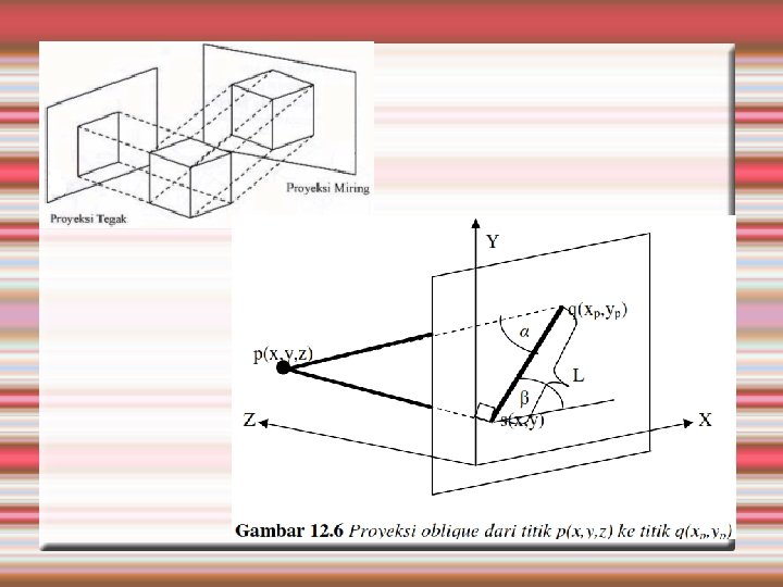 Proyeksi Miring (Oblique) Proyeksi miring adalah semacam proyeksi sejajar, tetapi dengan garis-garis proyeksinya miring dengan sudut kemiringan < 1800 terhadap bidang proyeksi. Proyeksi oblique diperoleh dengan cara membuat sinar proyeksi tidak tegak lurus terhadap bidang proyeksi. Proyeksi oblique membutuhkan dua buah sudut yaitu α dan ß Seperti pada Gambar 12. 6. titik (x, y, z) diproyeksikan menjadi titik q(xp, yp) di bidang proyeksi