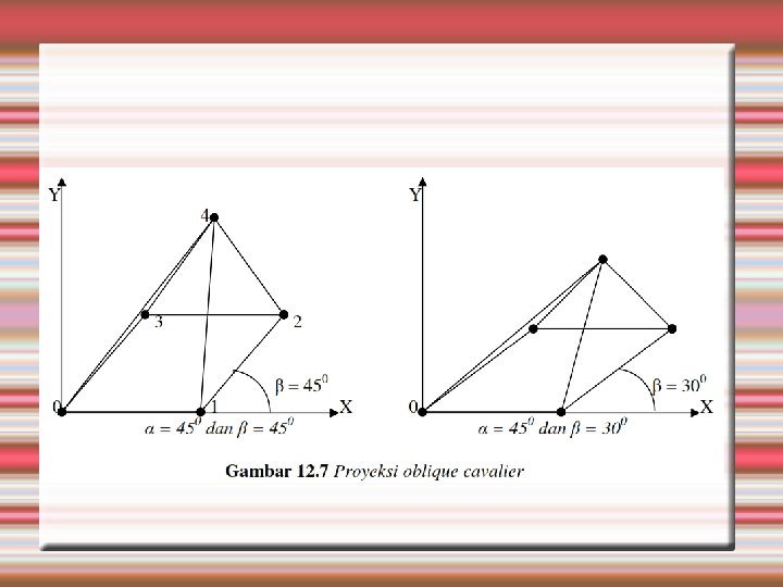 Apabila α = 900 maka L 1 = 0 sehingga dari rumus 4 kita memperoleh proyeksi orthograhic, tetapi apabila L 1 tidak sama dengan 0 maka kita akan memperoleh proyelsi oblique. Proyeksi oblique dengan α = 450 disebut sebagai proyeksi cavalier, apabila α = 63, 434950 maka kita akan memperoleh proyelsi cabinet.