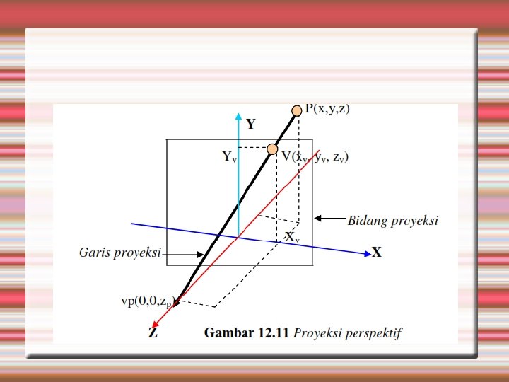 Gambar 12. 11 menunjukkan bagimana proyeksi perspektif terjadi. Titik p(x, y, z) diproyeksikan ke bidang x-y melalui garis proyeksi yang memotong sumbu z pada jarak z. Garis proyeksi akan memotong bidang proyeksi di titik v(xv, yv, zv).