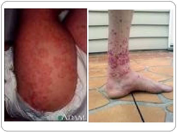 Lesões vasos cutâneos pode causar angioedema, que precede a púrpura Edema em áreas inferiores ou de maior distensibilidade (palpebras, lábios, períneo, dorso de mãos e pés)