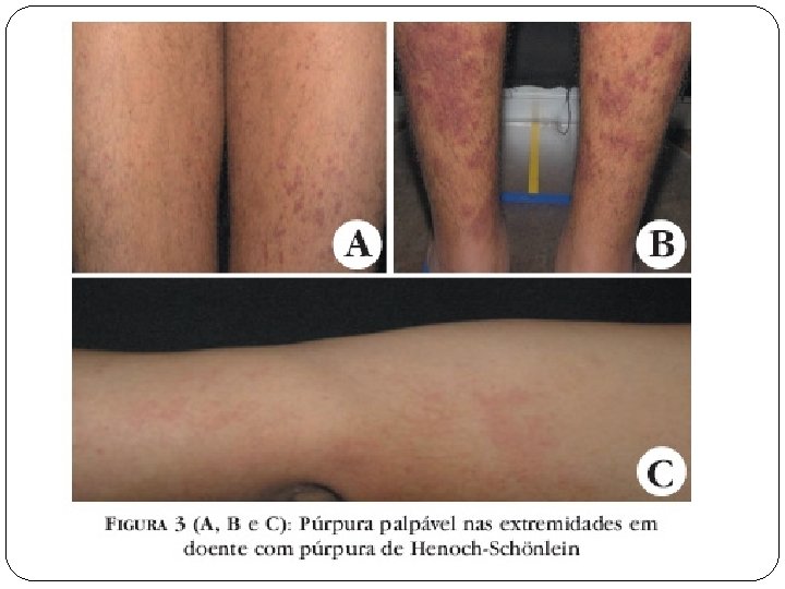 Manifestações clínicas Púrpura palpável 100% dos casos Processo inflamatório aumenta a permeabilidade vascular, causando extravasamento de seu conteúdo, inclusive hemácias. A seqüencia: mácula eritematosa, pápula e púrpura palpável Lesões difusas, simétricas, de vários tamanhos, mais freqüente em MMII (devido a maior pressão intravascular nessa região, pela força da gravidade ) Cada lesão evolui em 1 a 4 semanas, podendo deixar máculas hipercrômicas após a resolução