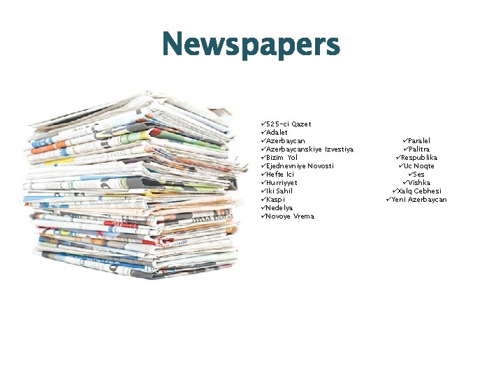 Newspapers ü 525 -ci Qazet üAdalet üAzerbaycanskiye Izvestiya üBizim Yol üEjednevniye Novosti üHefte Ici üHurriyyet üIki Sahil üKaspi üNedelya üNovoye Vrema üParalel üPalitra üRespublika üUc Noqte üSes üVishka üXalq Cebhesi üYeni Azerbaycan